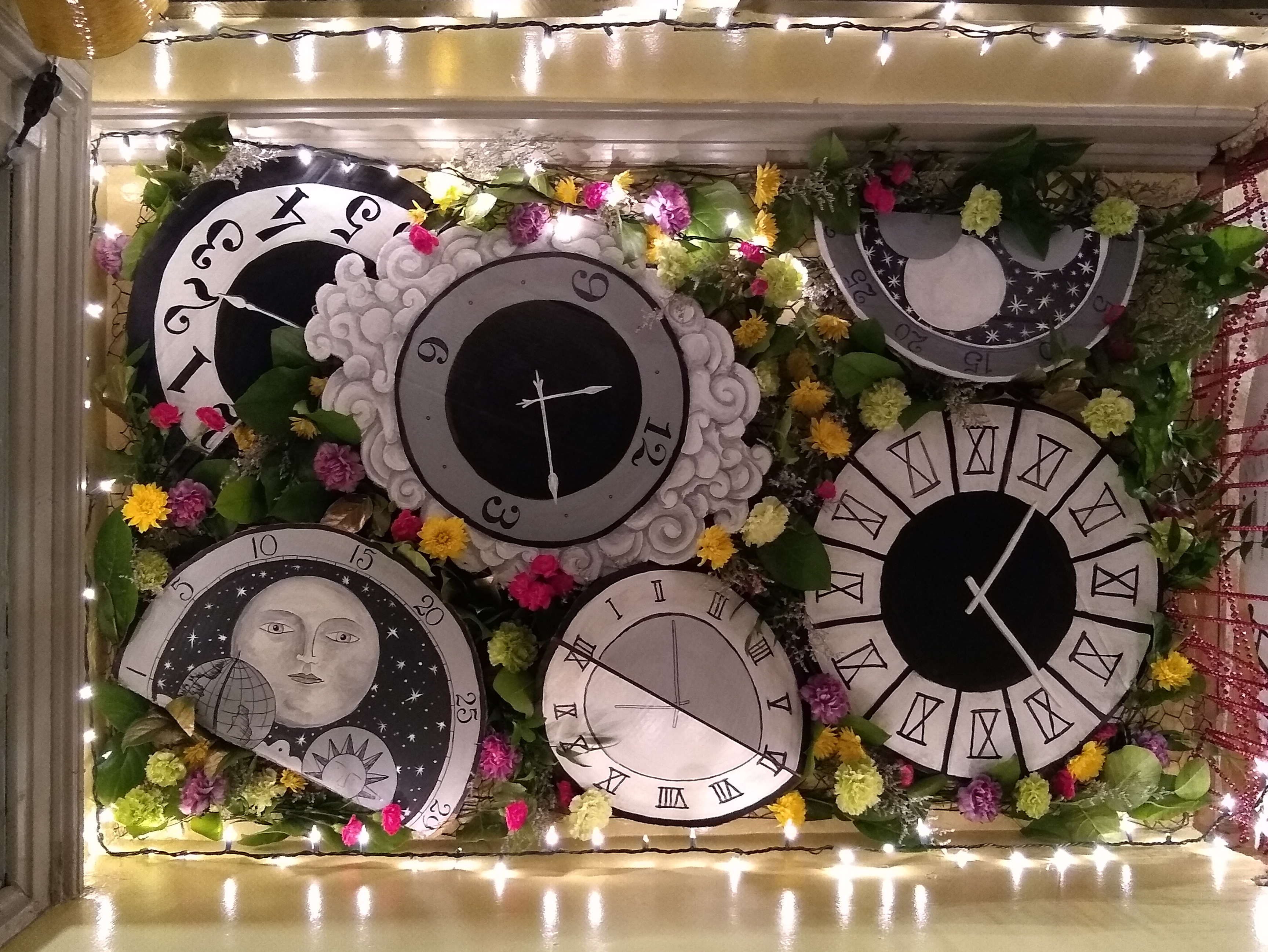 IMG_20190802_000844357 Previous Next Published October 14, 2019 at 3456 × 2596 in Floral Design Ceiling Installation – Hand painted paper clocks and live floral decor – Crownival 2019 – Detroit, MI