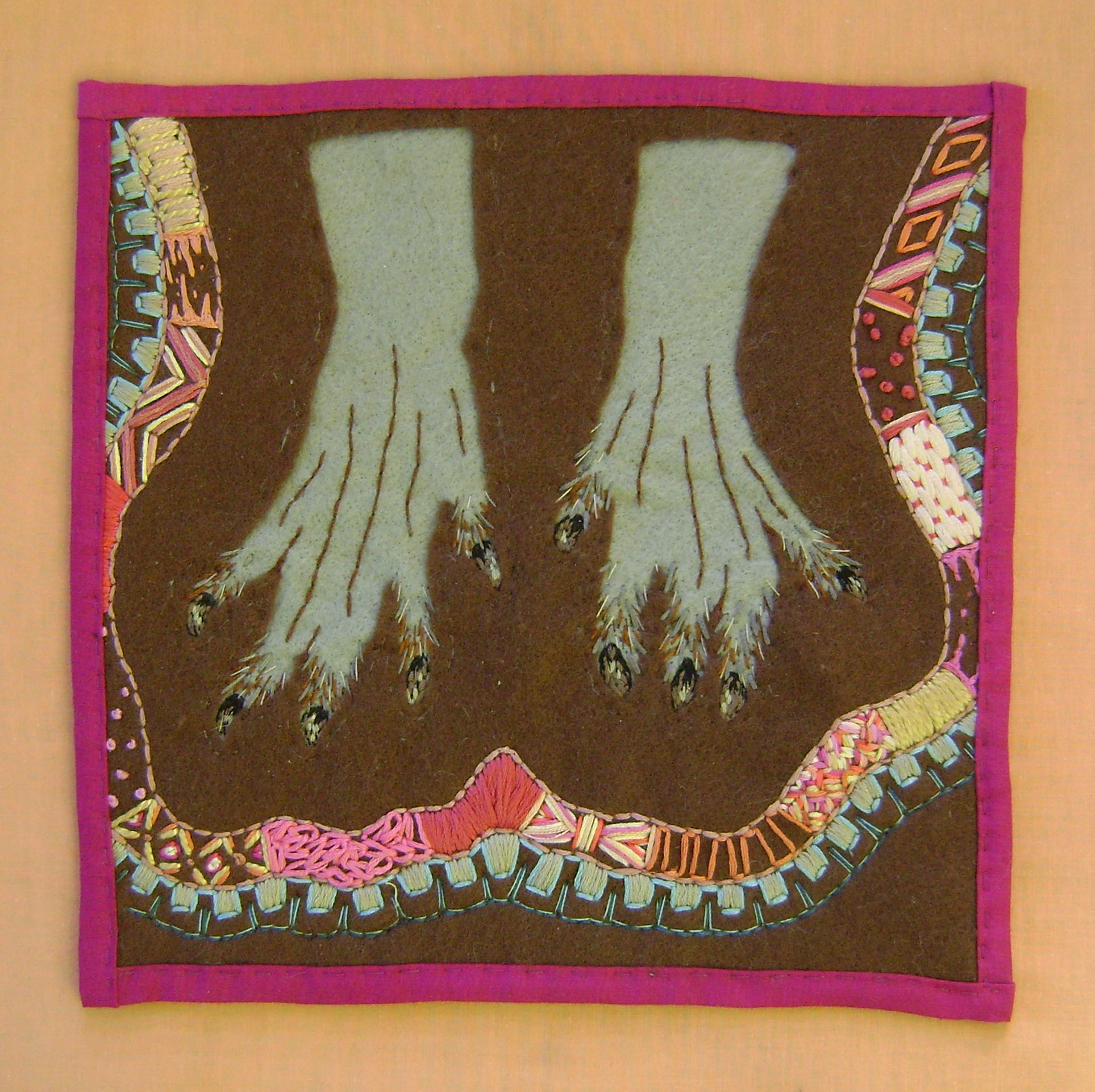 Ode to Squirrel Feet – Salvaged fabric and embroidery floss – 12in x 12in – 2013 Previous Next Published August 30, 2018 at 1927 × 1921 in Textiles Ode to Squirrel Feet – Salvaged fabric and embroidery floss – 12in x 12in
